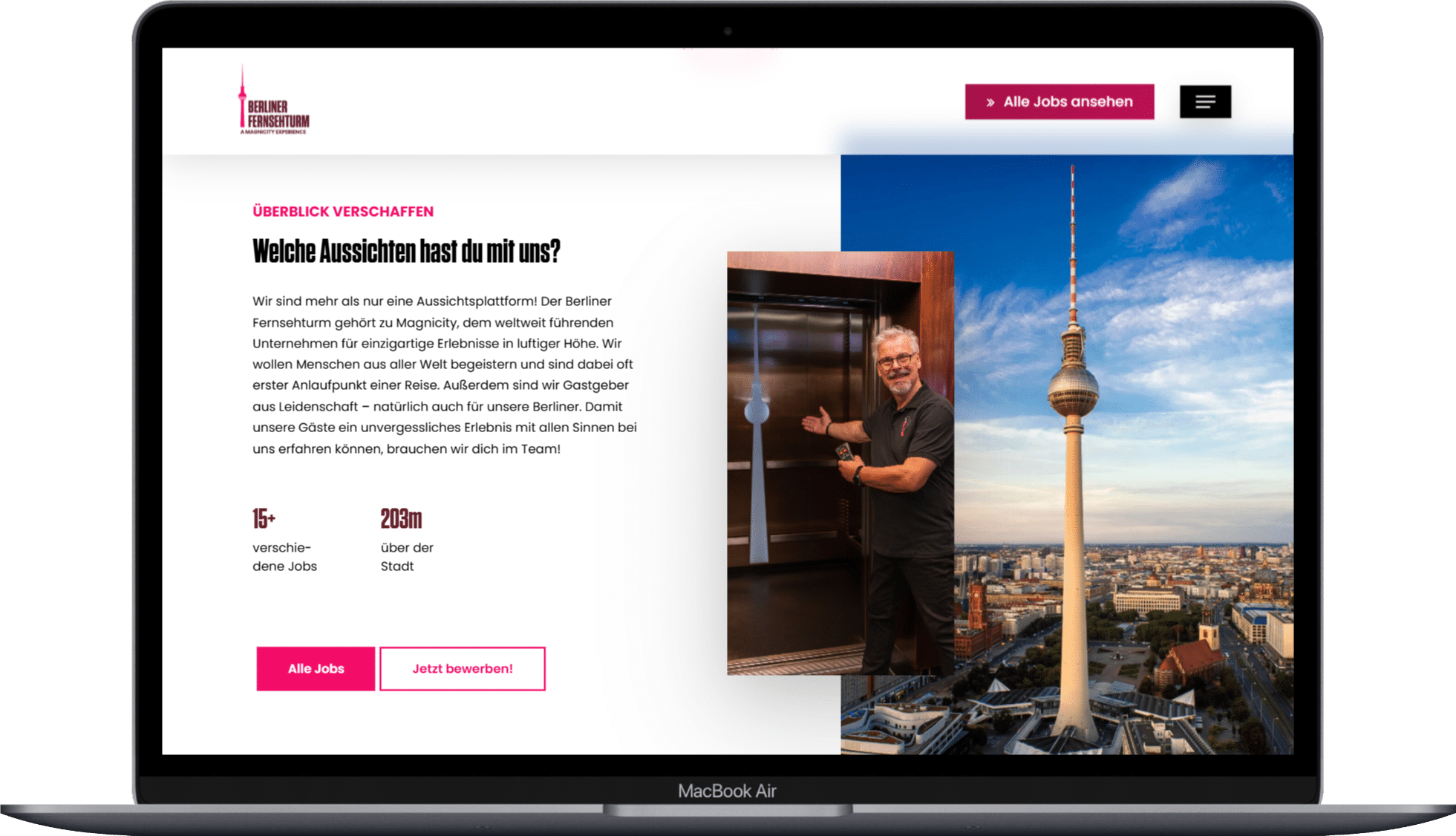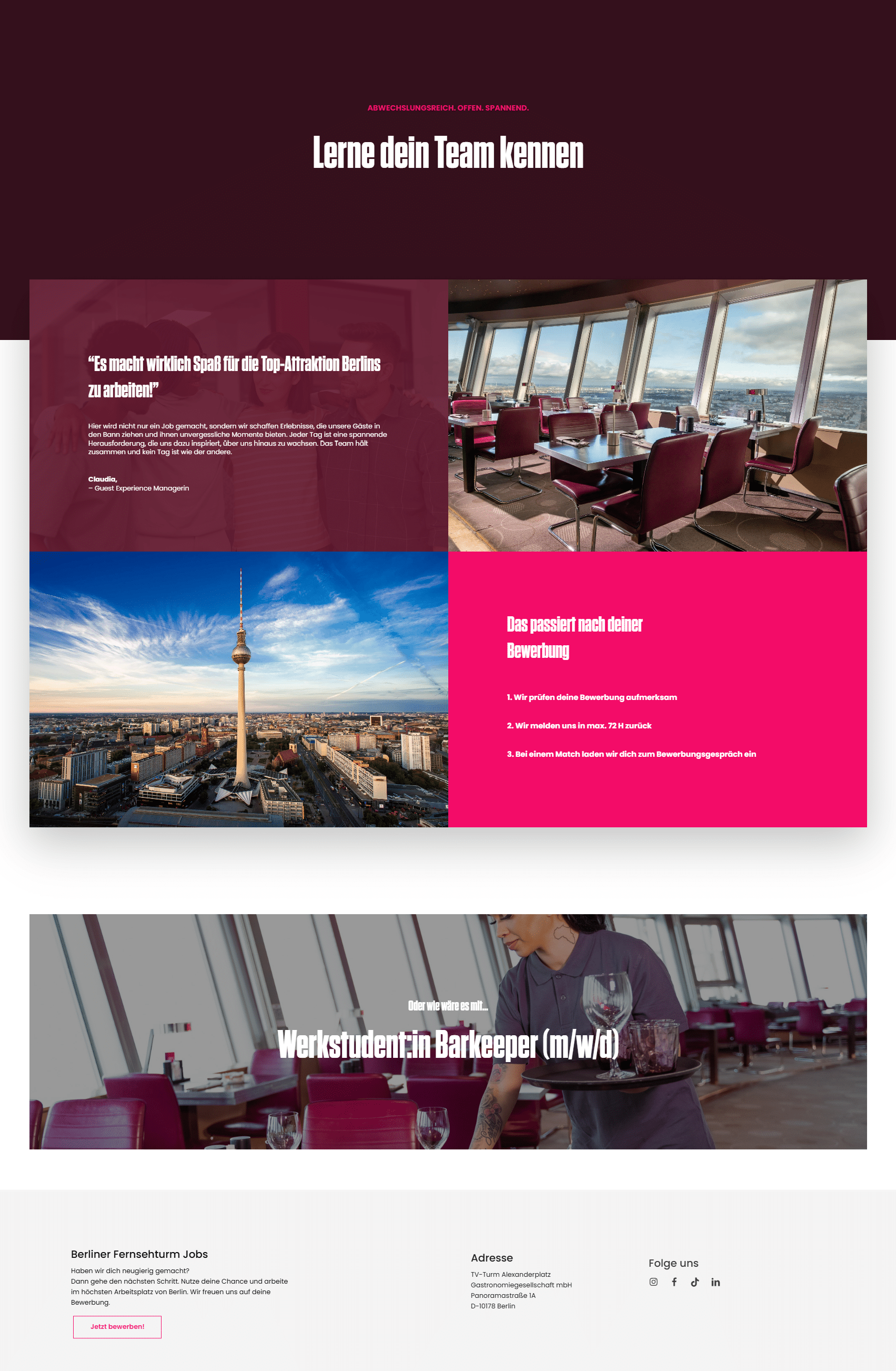 Für den Berliner Fernsehturm entwickelten wir eine moderne Karriereseite, die das Bewerben so einfach und intuitiv wie möglich macht – mit klarer Nutzerführung, mobiloptimiertem Design und einem Fokus auf Zugänglichkeit.