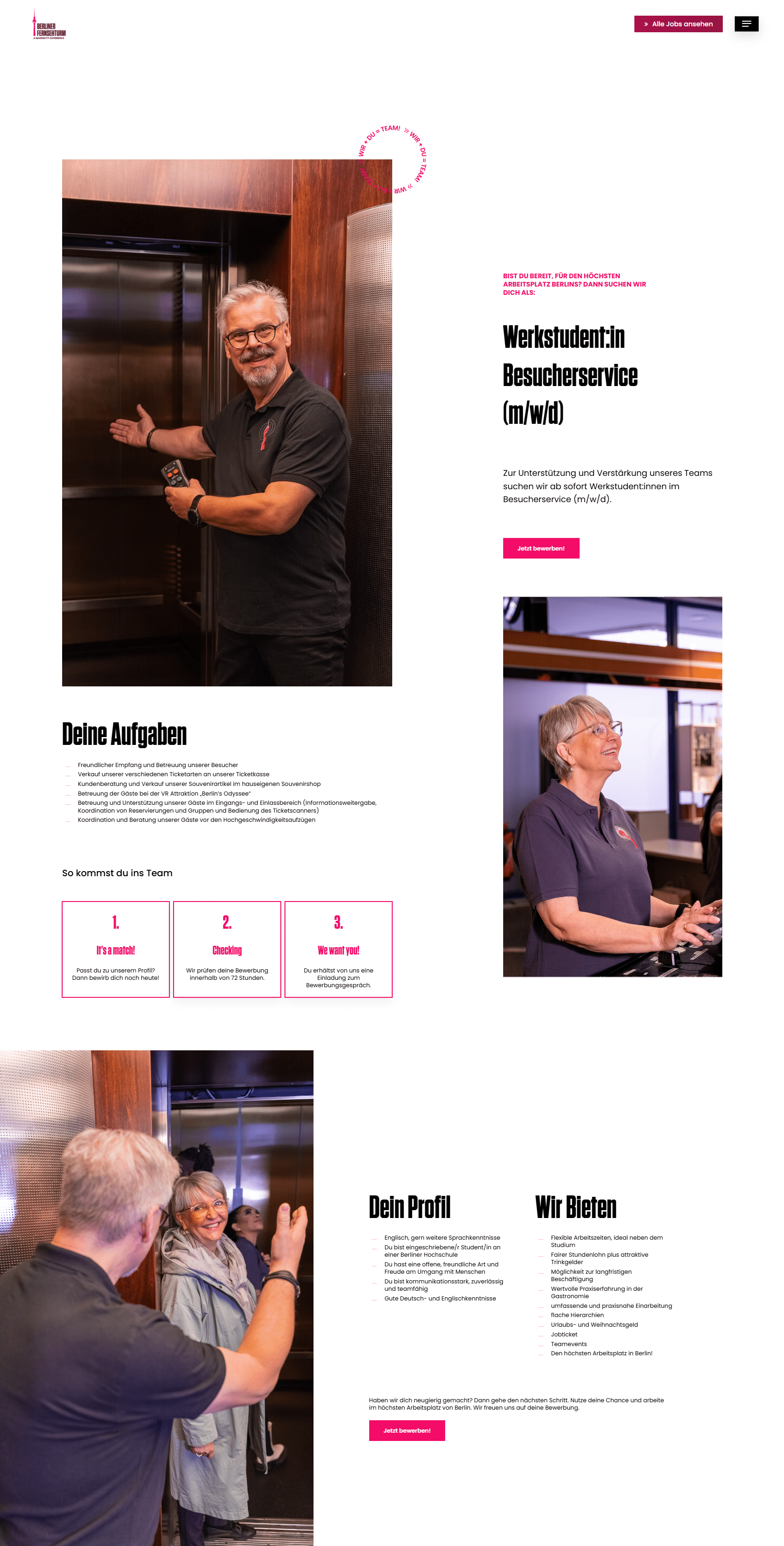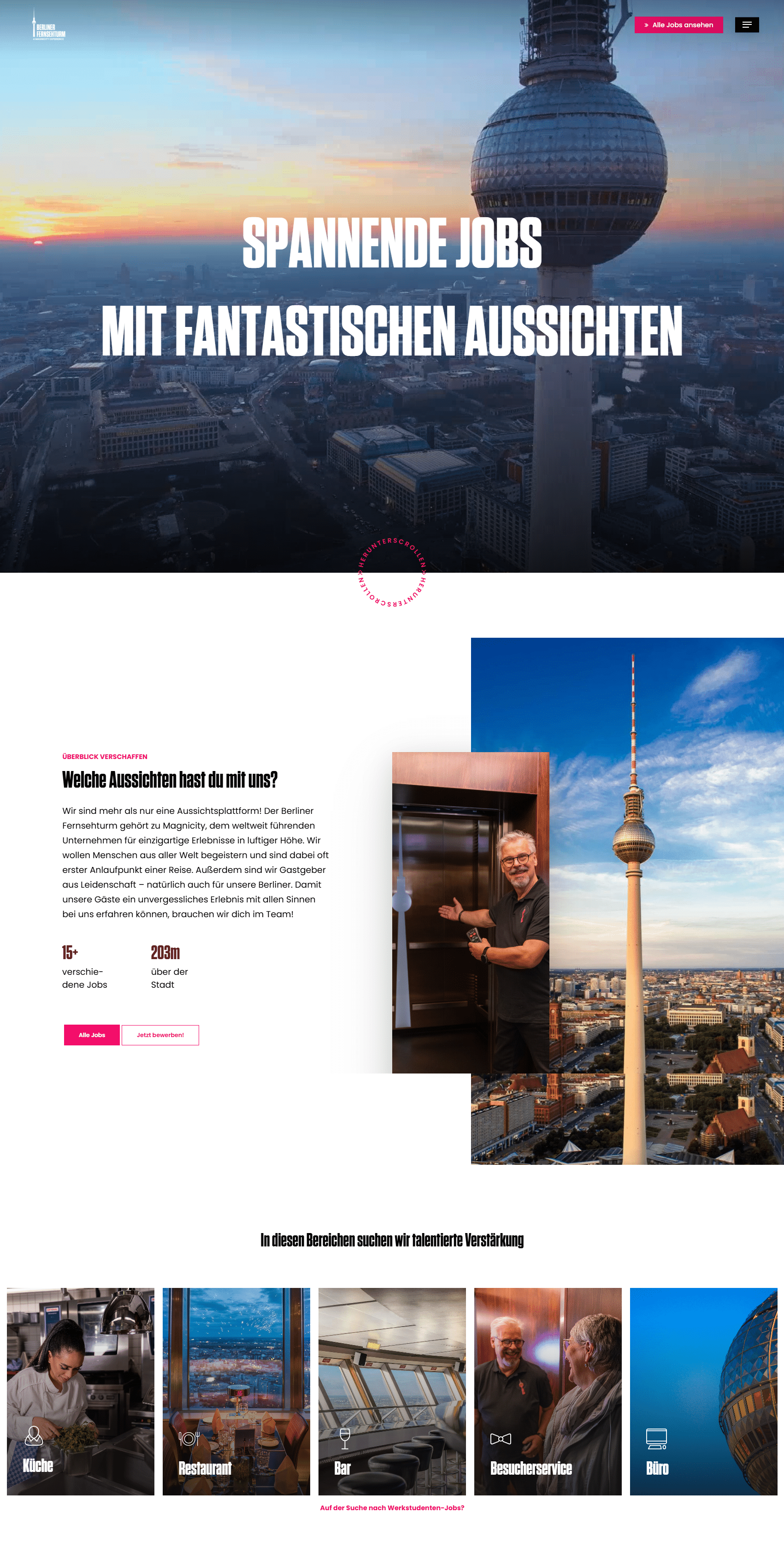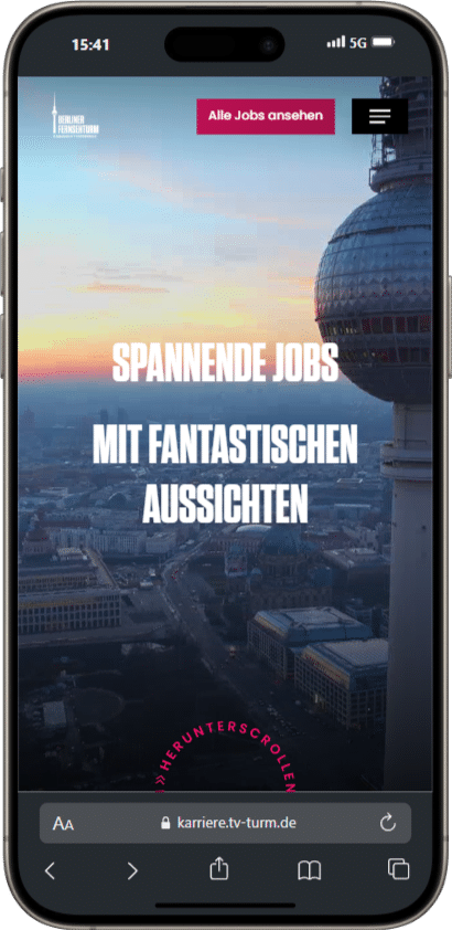 Die Karriereseite des Berliner Fernsehturms wurde von uns mit dem Ziel gestaltet, Bewerber schnell und unkompliziert zum passenden Job zu führen. Wir haben dabei großen Wert auf eine intuitive Navigation gelegt, die offene Stellenangebote klar strukturiert und mit wenigen Klicks zugänglich macht. Die bestehende Designsprache des Fernsehturms wurde konsequent weitergeführt, gleichzeitig haben wir eigene gestalterische Impulse gesetzt, um die Seite für eine jüngere Zielgruppe noch ansprechender zu machen. Ob vom Desktop oder Smartphone – der Bewerbungsprozess bleibt durchgehend klar, barrierearm und benutzerfreundlich. So unterstützt die neue Karriereseite aktiv das Recruiting eines der bekanntesten Wahrzeichen Berlins.